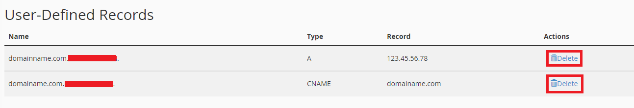 A Success message appears on successful removal of an A or CNAME Record.